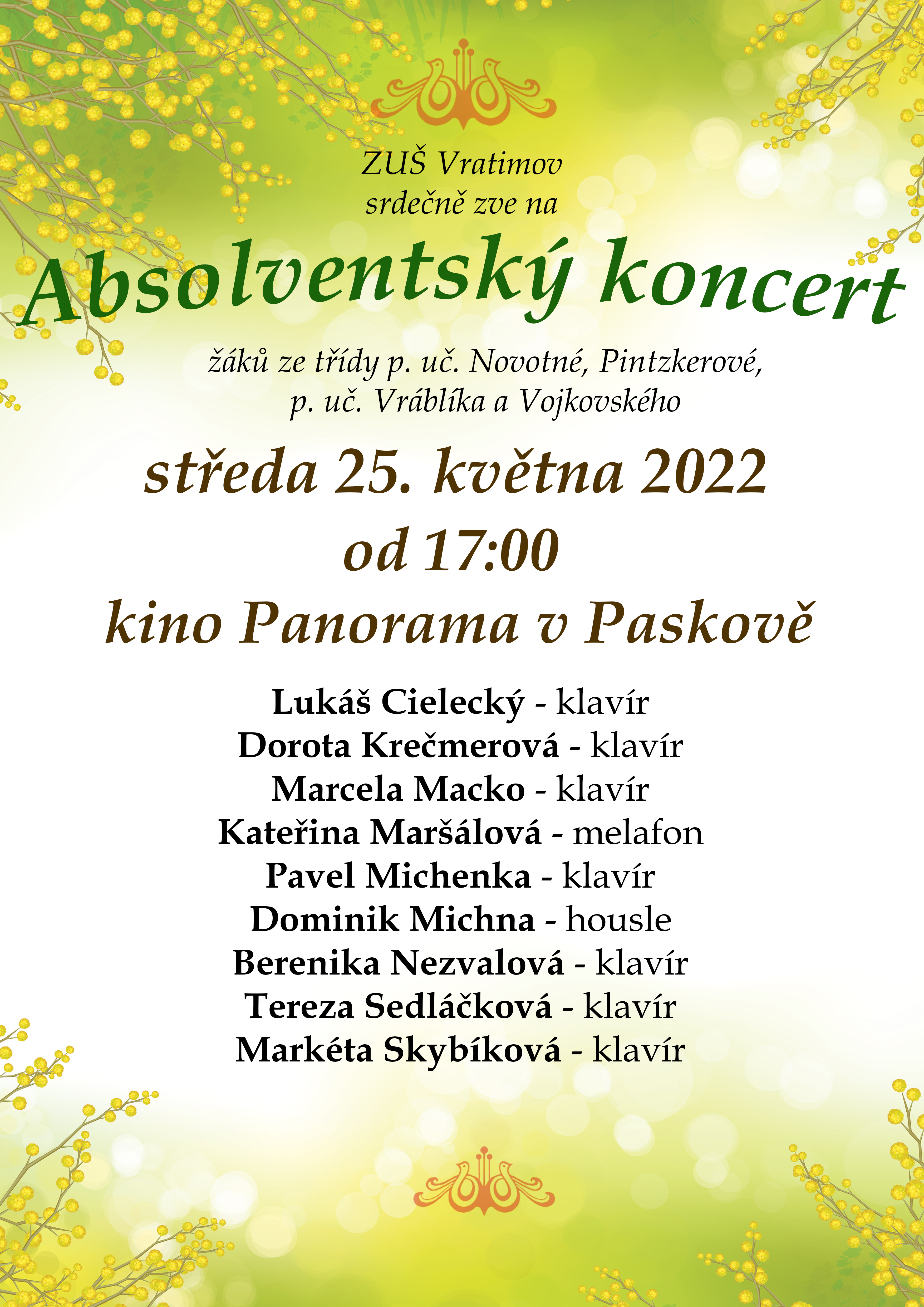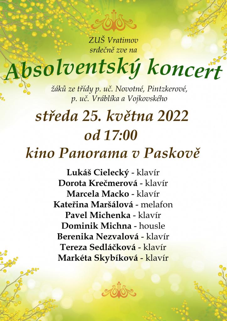 ZUŠ Vratimov srdečně zve na absolventský koncert žáků, který se uskuteční ve středu 25. května 2022 od 17:00 hodin v kině Panorama v Paskově.