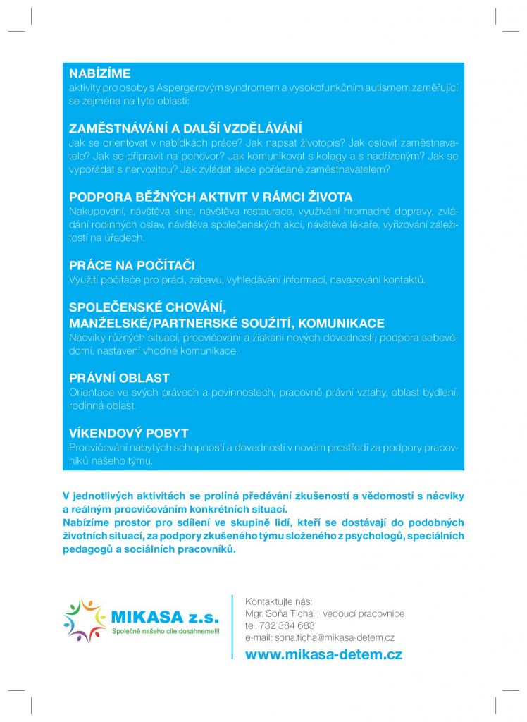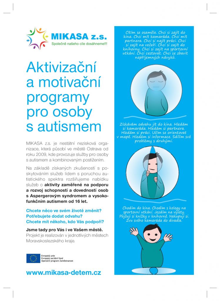Organizace MIKASA z.s. rozšiřuje aktivity projektu „Aktivizační a motivační programy pro osoby s autismem“ do dalších měst Moravskoslezského kraje. Cílem projektu je podporovat a motivovat jeho účastníky v překonávání životních překážek tak, aby se mohli co nejvíce zapojovat do běžného života – navazovat a udržovat vztahy s druhými lidmi, získat a udržet si práci, věnovat se svým koníčkům a zájmům.