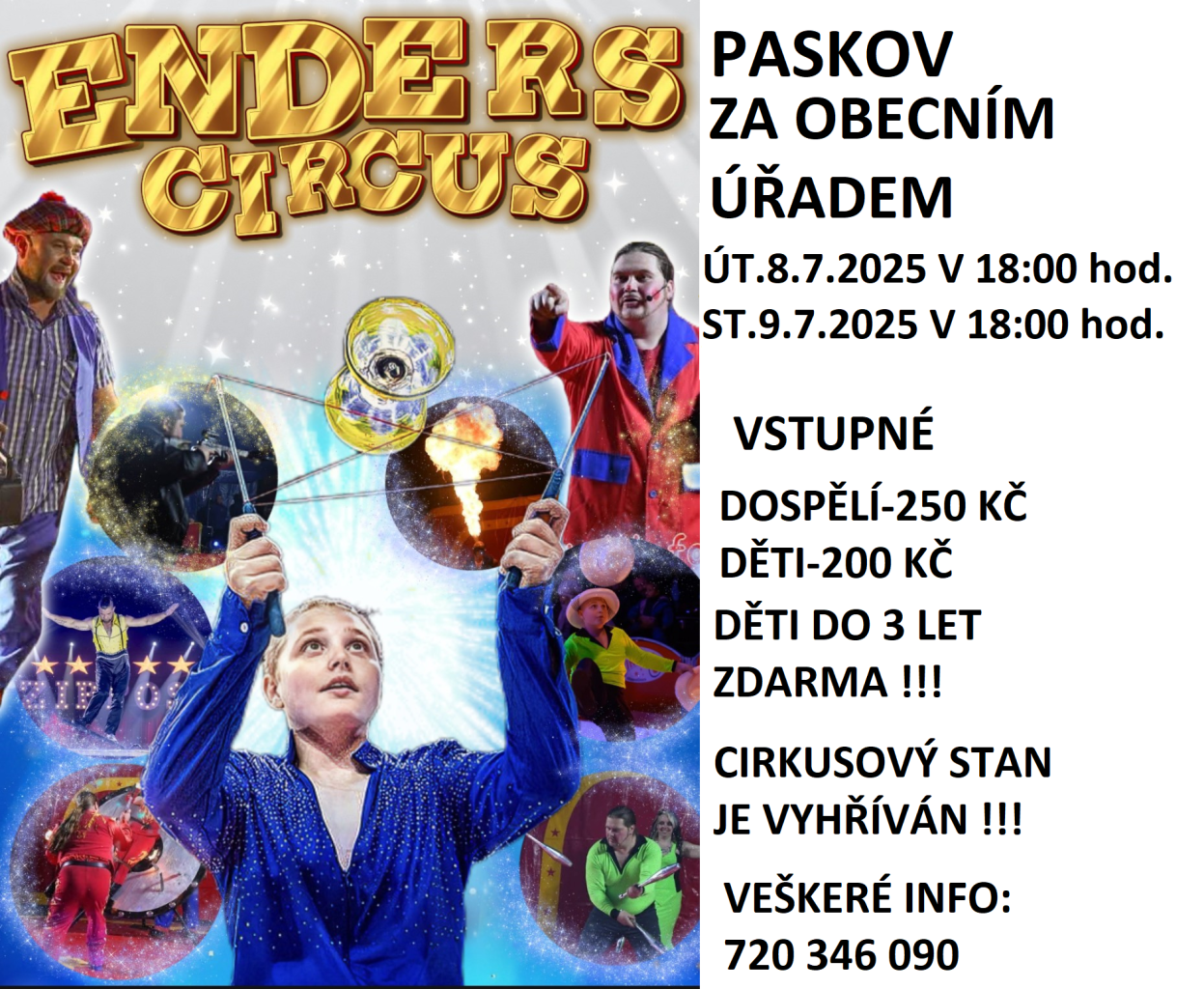 V úterý 8.7. a ve středu 9.7.2025 bude v Paskově hostovat cirkus Enders.