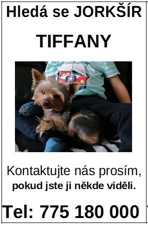 Hledá se Jorkšír slyšící na jméno Tiffany. V případě nálezu prosím kontaktujte majitelku na tel.: 775 180 000, popř. Městský úřad v Paskově, tel.: 555 333 619 nebo podatelnu (kancelář č. 111 v přízemí).
