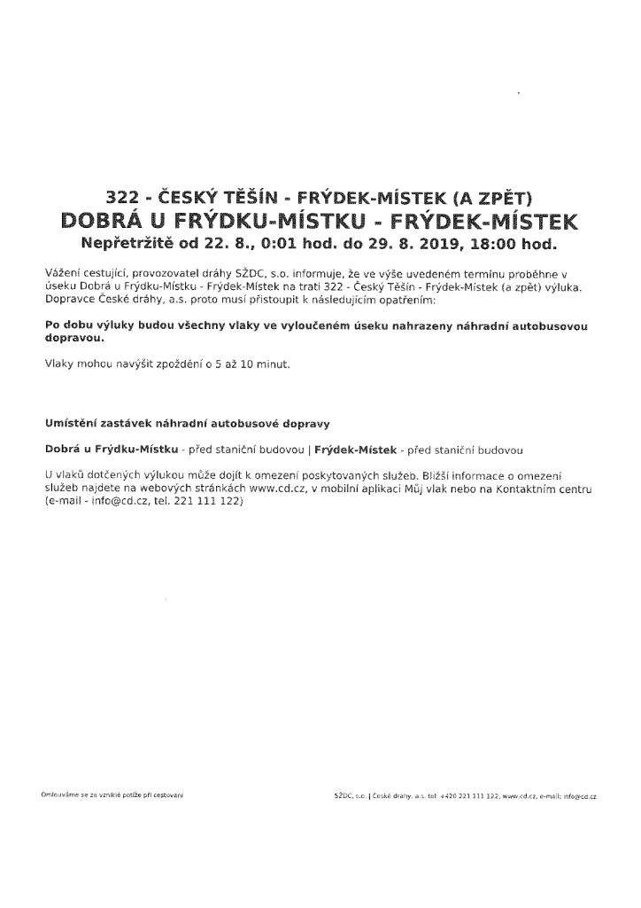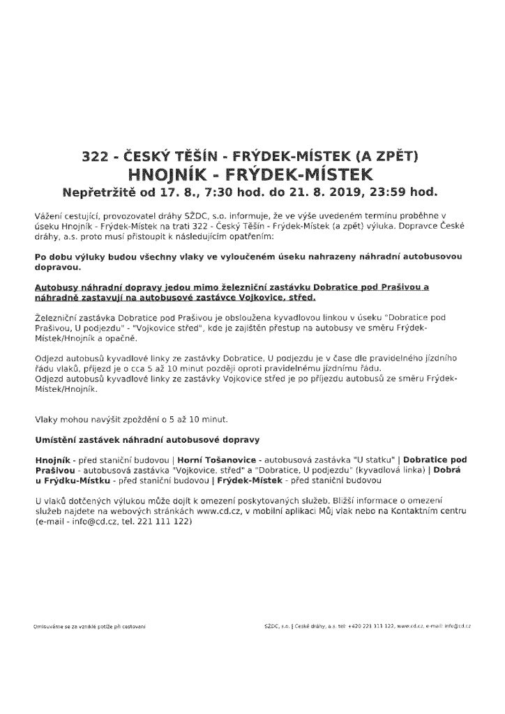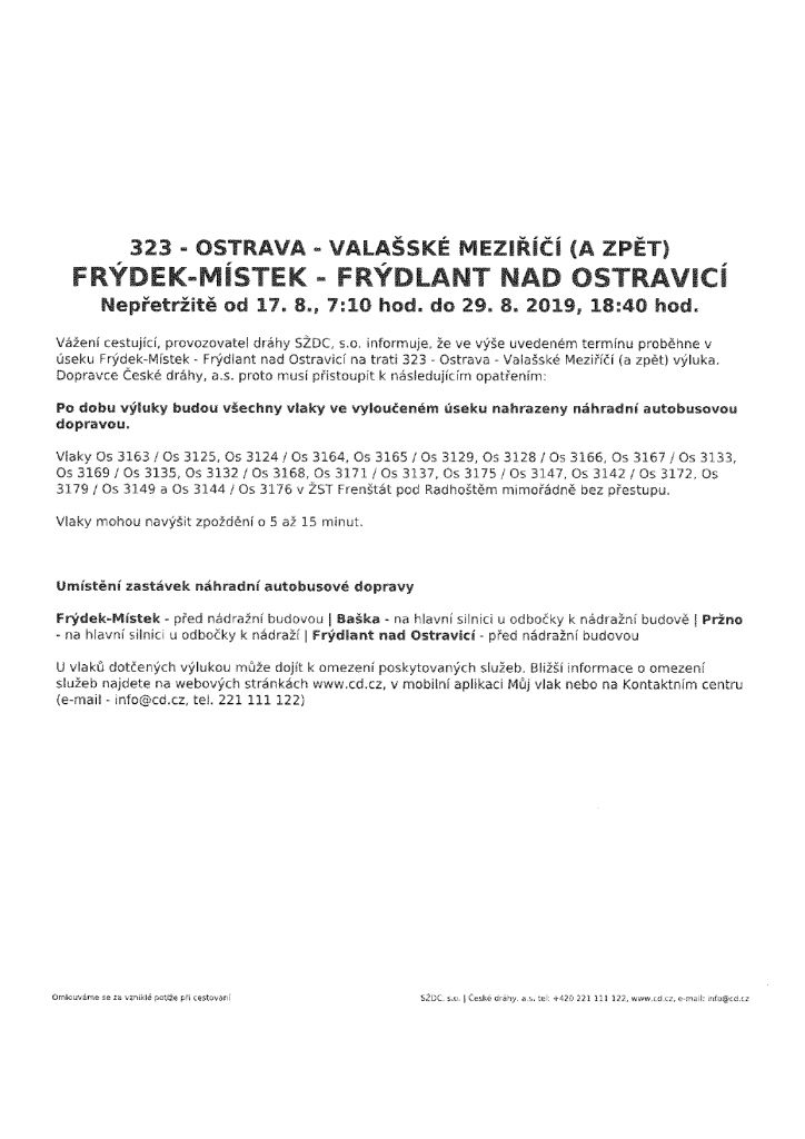Upozorňujeme na nadcházející výluky na železniční trati Frýdek-Místek - Frýdlant nad Ostravicí (od 17.8. do 29.8.) a Frýdek-Místek - Dobrá (od 22.8. do 29.8.) - Hnojník (od 17.8. do 29.8.)