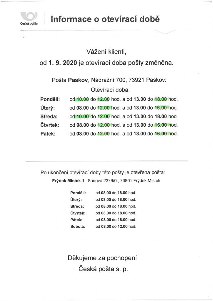 Dále informujeme, že od 1.9.2020 dojde ke změně otevírací doby České pošty v Paskově.