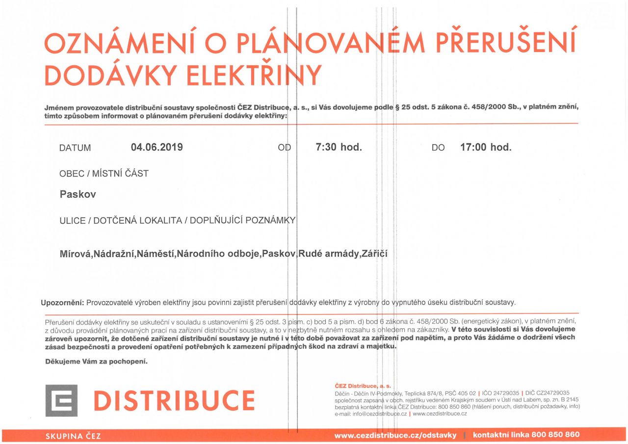 Oznamujeme občanům, že dne 4.6.2019 v čase od 7:30 do 17:00 dojde k plánovanému přerušení dodávky elektřiny a to na ulici Mírová, Nádražní, Náměstí, Národního odboje, Rudé armády a Zářičí. Bližší vyznačení naleznete v přiložené mapě.
