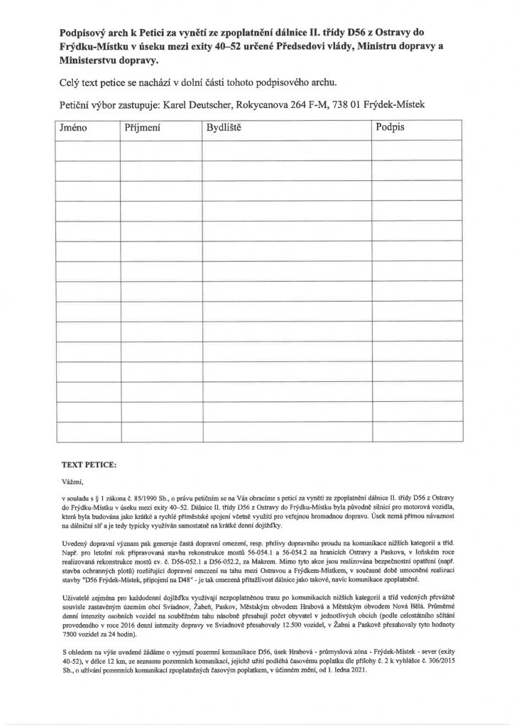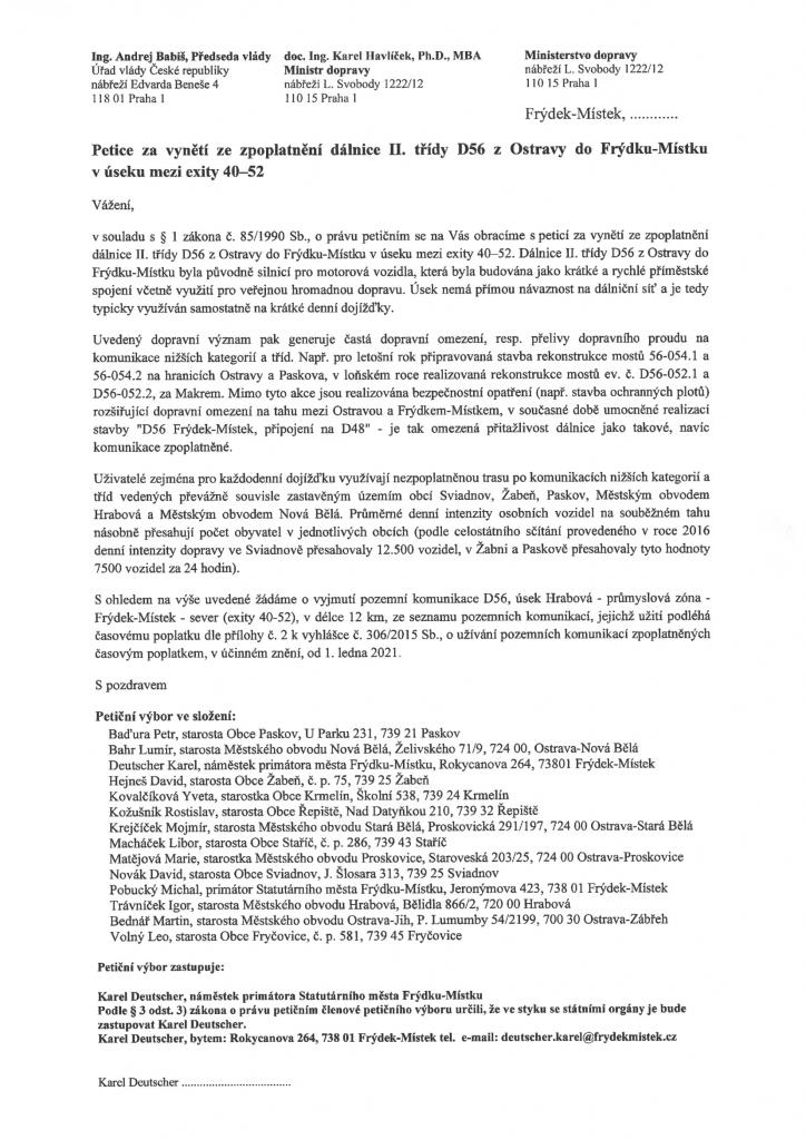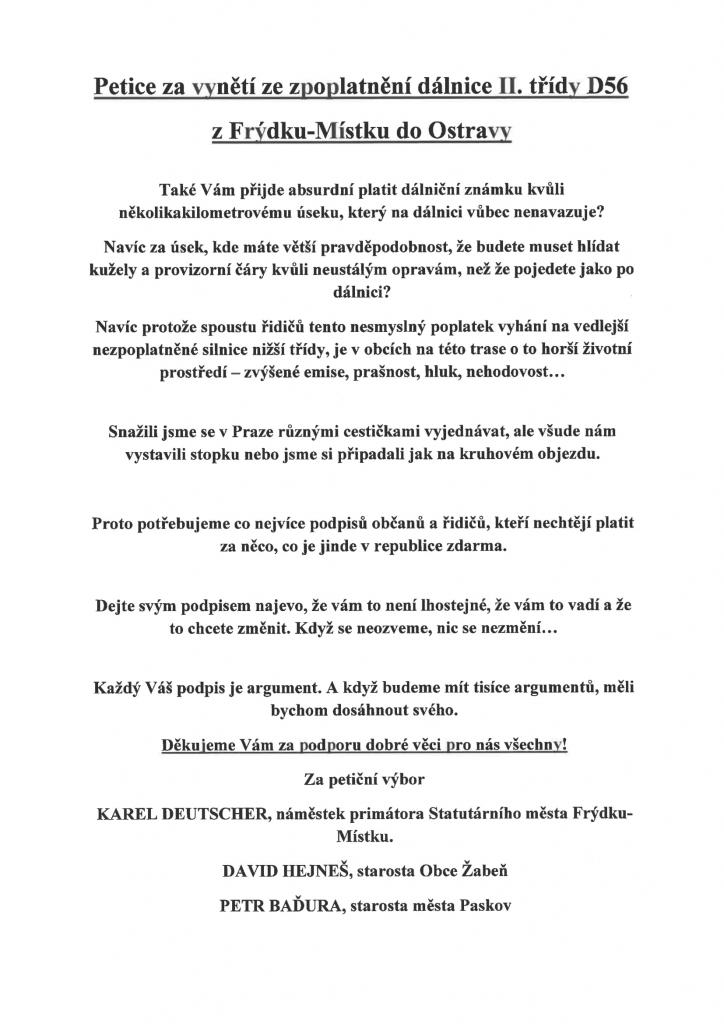 Petice za vynětí ze zpoplatnění dálnice II. třídy D56 z Frýdku-Místku do Ostravy
