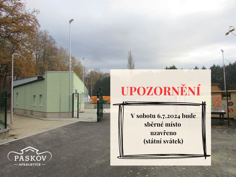 Upozorňujeme občany, že sběrné místo bude v sobotu 6.7.2024 z důvodu státního svátku uzavřeno.