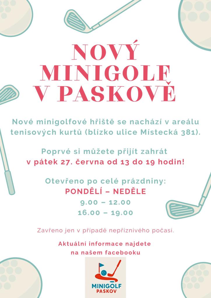 Poprvé si můžete přijít zahrát už v pátek 27. června od 13 do 19 hodin! Následně bude otevřeno každý prázdninový den od 9 do 12 a od 16 do 19 hodin (v případě nepříznivého počasí bude zavřeno). Aktuální informace se vždy dozvíte na facebookovém profilu Minigolf Paskov.