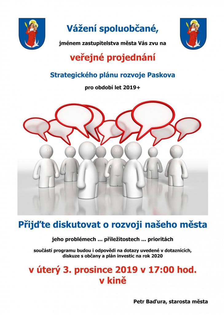Vážení spoluobčané, jménem zastupitelstva města Vás zveme na veřejné projednání Strategického plánu rozvoje Paskova pro období let 2019+, které se uskuteční v úterý 3. prosince 2019 v 17 hodin v kině Panorama.