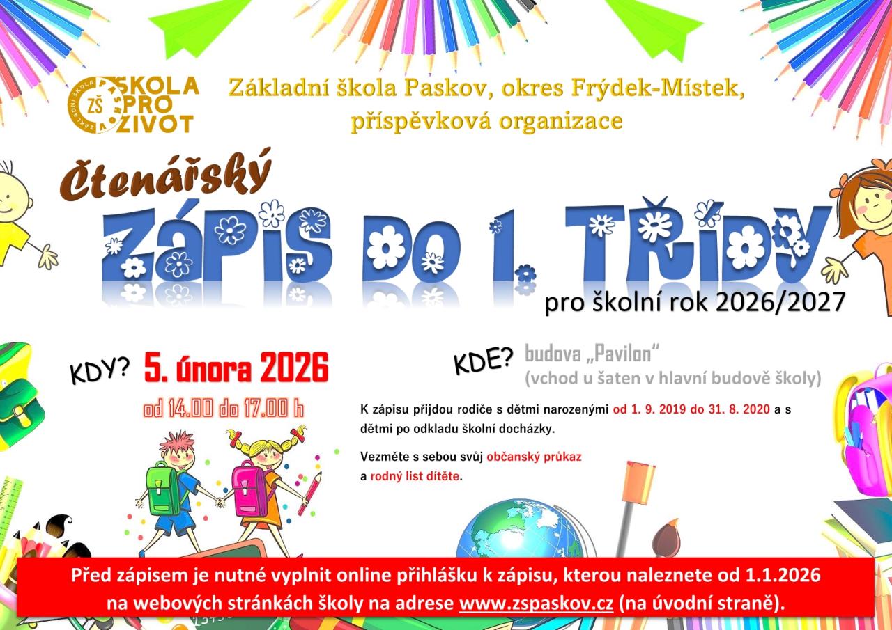 Před zápisem je nutné vyplnit online přihlášku k zápisu, kterou naleznete od 1. 1. 2026 na webových stránkách školy www.zspaskov.cz (na úvodní straně).
