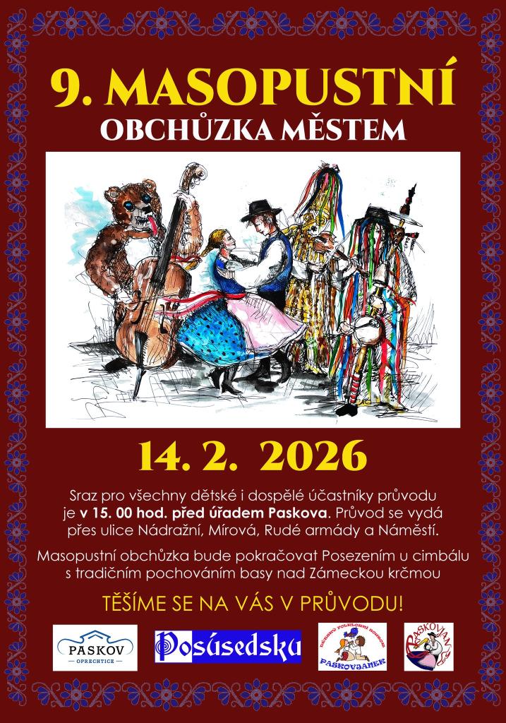 Zveme malé i velké, rodiny, sousedy i pocestné, ať si nasadí masky, obléknou kostýmy a přidají se k nám!!!! Společně projdeme městem, připomeneme si staré masopustní zvyky a užijeme si čas tak, jak to dělávali naši předkové – spolu a s radostí.