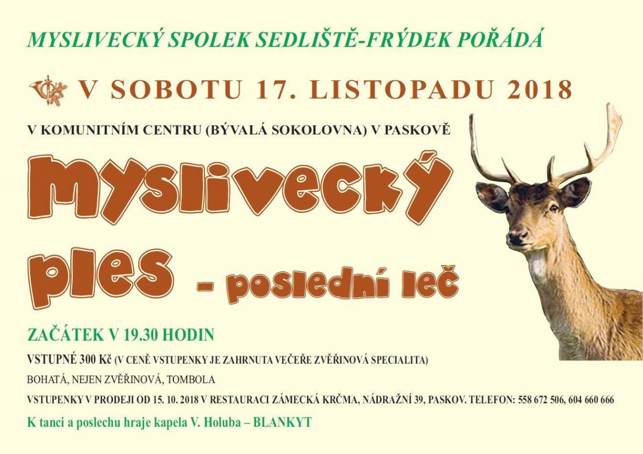 Po dlouhé době se podařilo pro paskováky, a nejen pro ně, uspořádat v Paskově myslivecký ples. Kdysi hojně navštěvované myslivecké bály byly v Paskově oblíbené. Snad tak tomu bude i tentokrát.