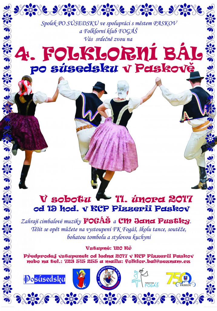 Spolek PO SÚSEDSKU Vás srdečně zve na 4. FOLKLORNÍ BÁL a to 11.2.2017 od 19hodin v KCP. Cena 120 Kč, prodej vstupenek v KCP Pizzerii Paskov, v trafice u paní Liškové nebo na tel. 723 515 255, folklor.bal@seznam.cz.